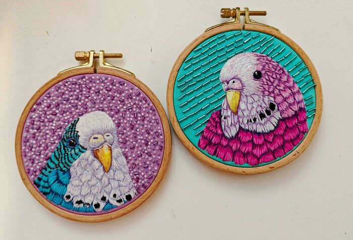 "I’m Used To Working On Pet Portraits With Just Their Faces Showing, But For This Wedding Ring Holder, The Lady Wanted The Whole Picture, Including Their Bodies Because Of Their Cute Pose. I Decided To Tackle It, And After 49 Colors Of Thread And 67 Hours Of Stitching, Here It Is! 🥰❤️"