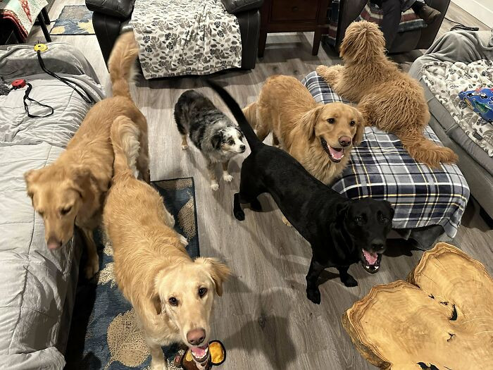 "My Father-In-Law Added His 2 Dogs To Our 2, Then Our Guests Today Brought Their 2 Dogs. Happy Thanksgiving From 6 Furry Friends"